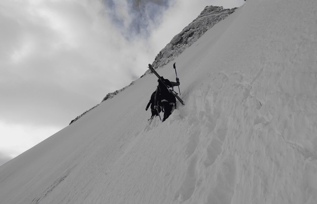L’entrée de l’article, c’est une superbe photo de Julie, lors de notre descente en versant Nord-Est du Vélan durant le mois de mai 2024. Une ligne qui traînait dans mon esprit depuis quelques années.