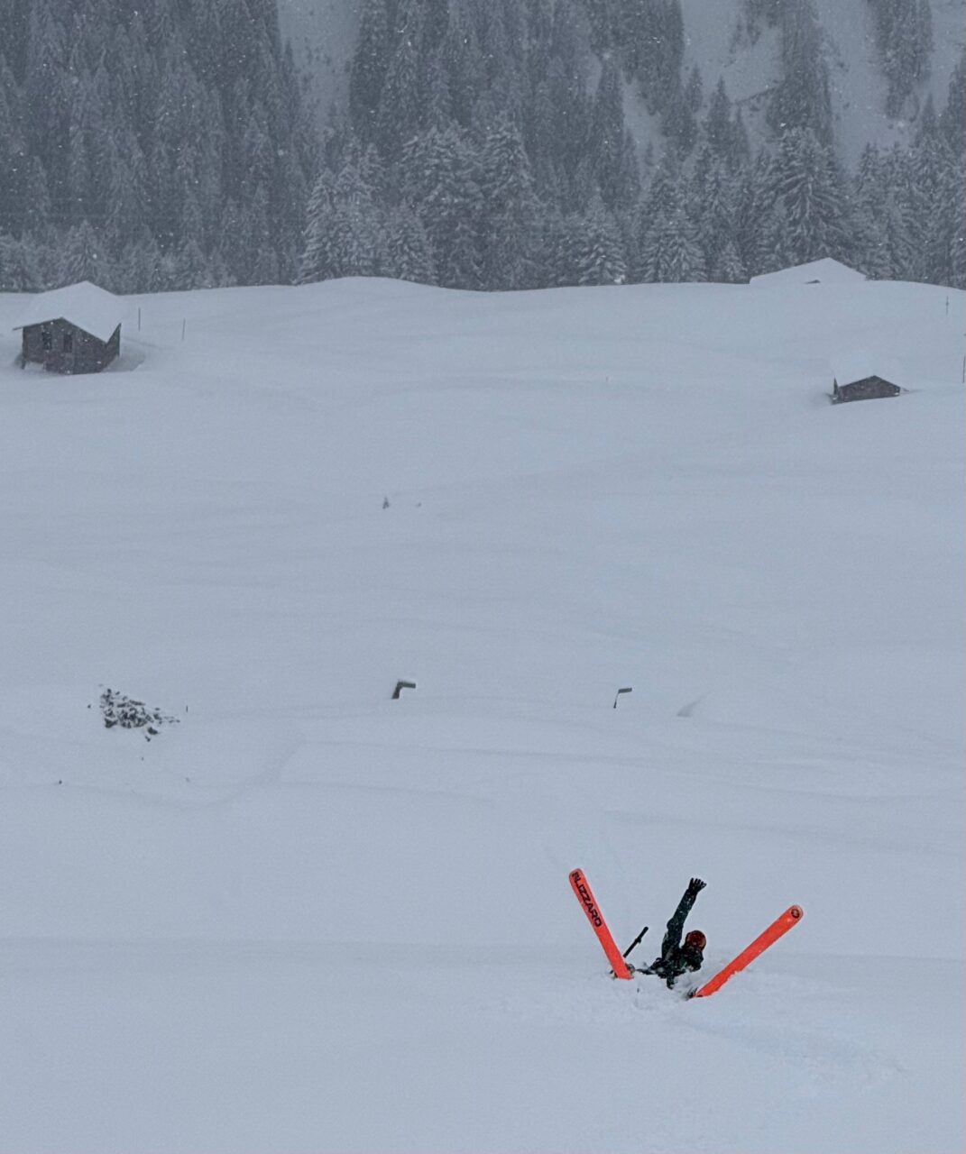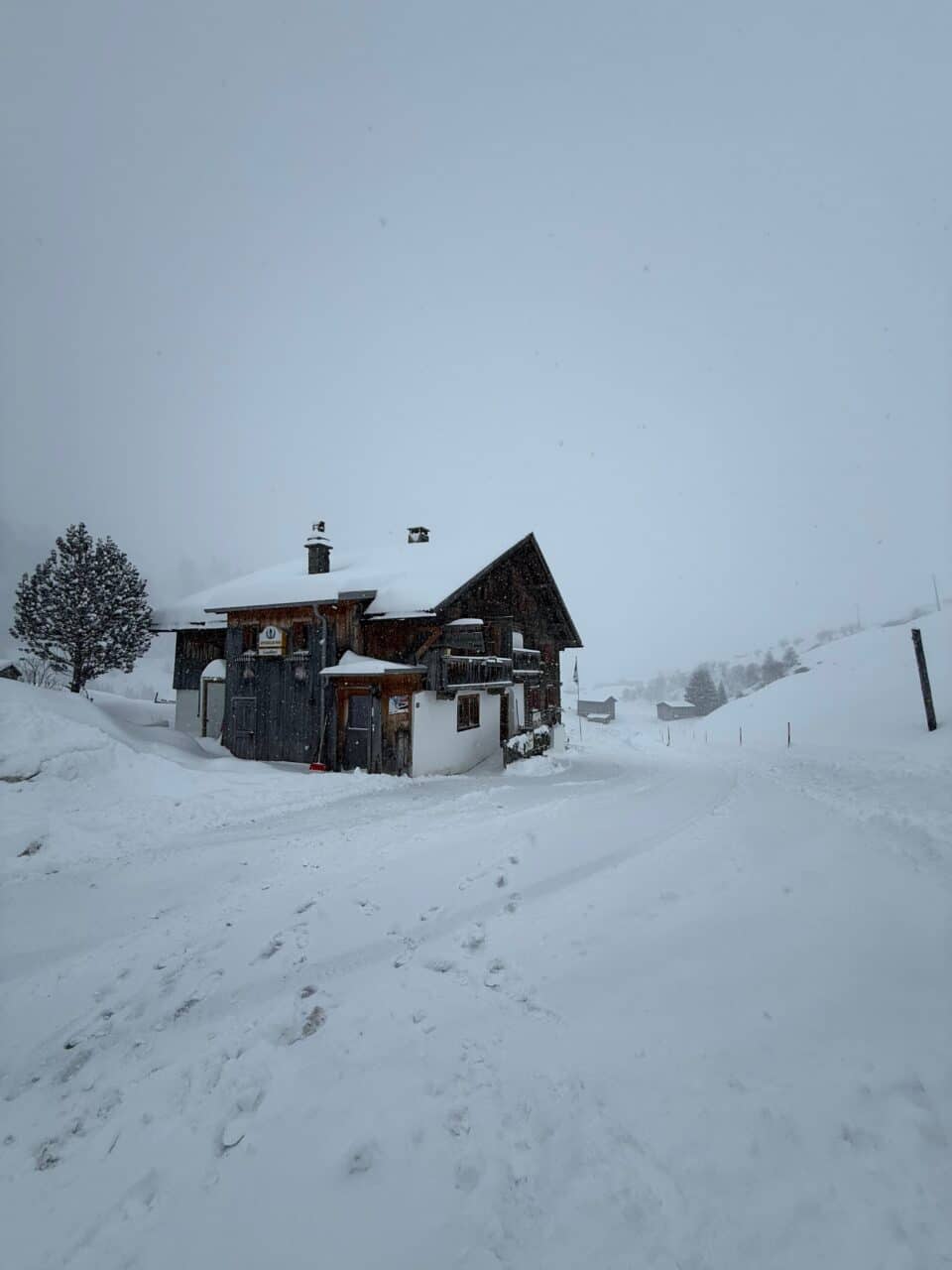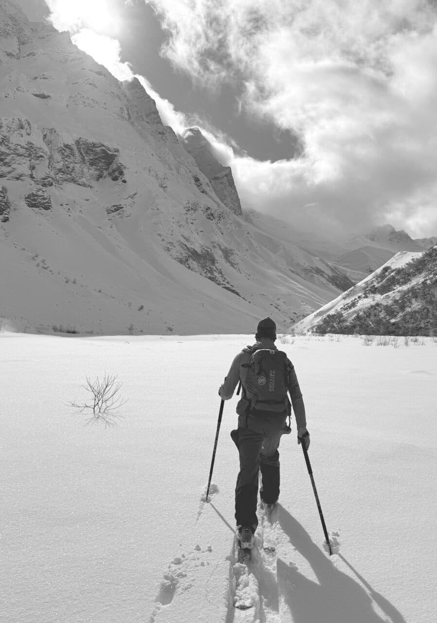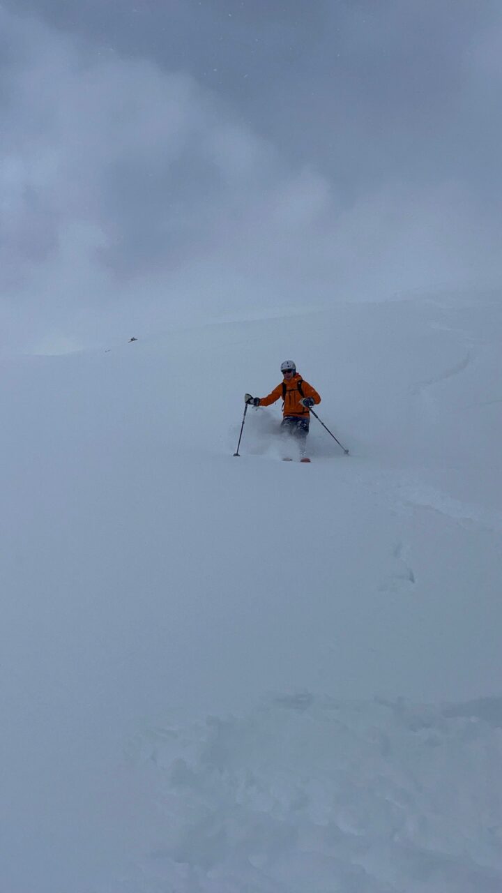 Dans la soirée la neige commence à tomber et ne s’arrêtera plus pendant deux jours. Les cascades du fond de la vallée sont plâtrées et tous les itinéraires deviennent trop dangereux. Nous feront donc du ski! Les pentes sont douces, des sapins et des chalets offrent un peu de visibilité puis une éclaircie inattendue nous offre une descente mythique.