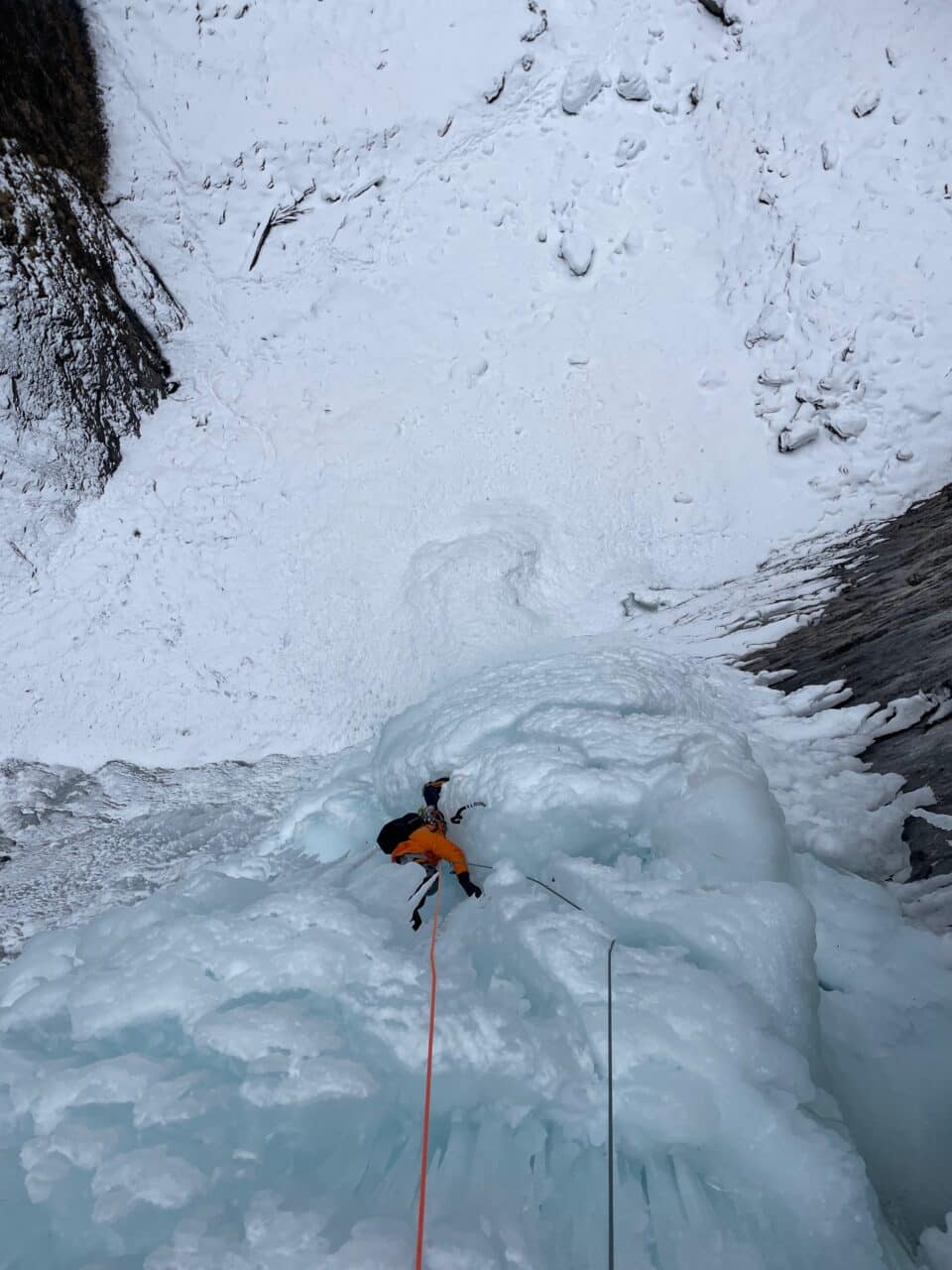 Notre deuxième objectif était Fallend Bach. Un accès un peu technique peut rebuter des grimpeurs peu expérimentés, attention. La première longueur est en glace très aérée et un peu brulée par le soleil. Ensuite on remonte le ruisseau gelé. Enfin pas tout à fait.